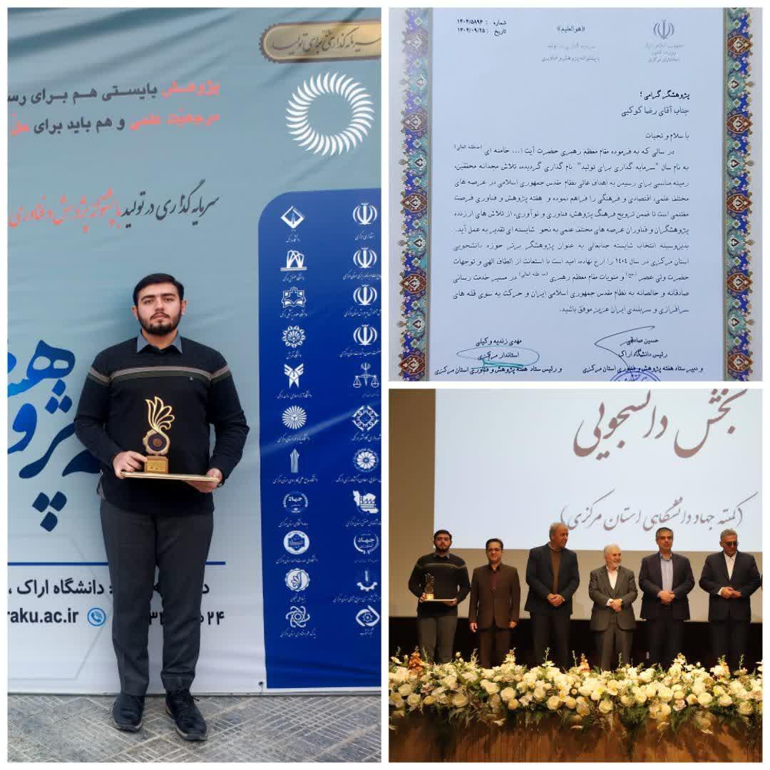 افتخارآفرینی دبیر کانون قرآن و عترت سازمان دانشجویان جهاددانشگاهی استان مرکزی در جشنواره پژوهشگران و فناوران استان