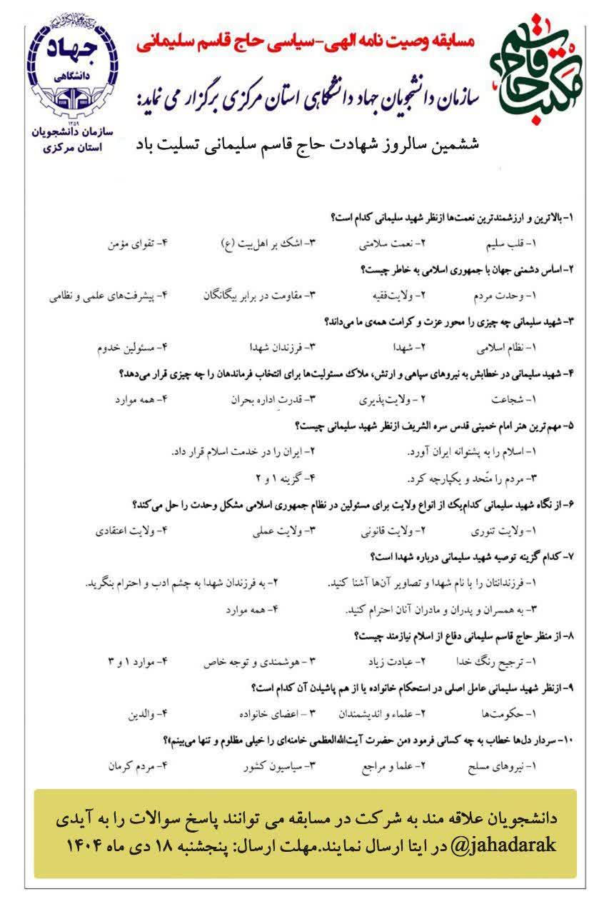 اعلام فراخوان مسابقه "وصیتنامه الهی ـ سیاسی شهید سلیمانی" در استان مرکزی