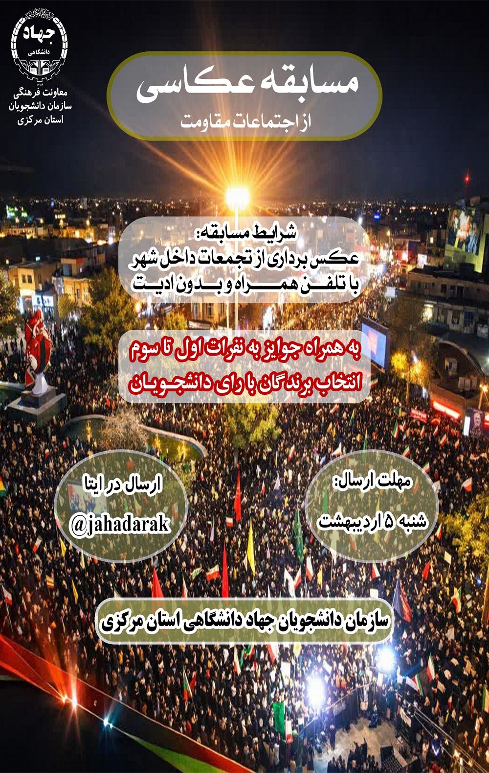 وی افزود: این مسابقه با محوریت اجتماعات مقاومت است و شرکت کنندگان باید تصاویر خود را از تجمعات داخل شهر تهیه و تا روز شنبه، ۵ اردیبهشتماه از طریق آیدی jahadarak @ در پیام رسال ایتا ارسال نمایند.