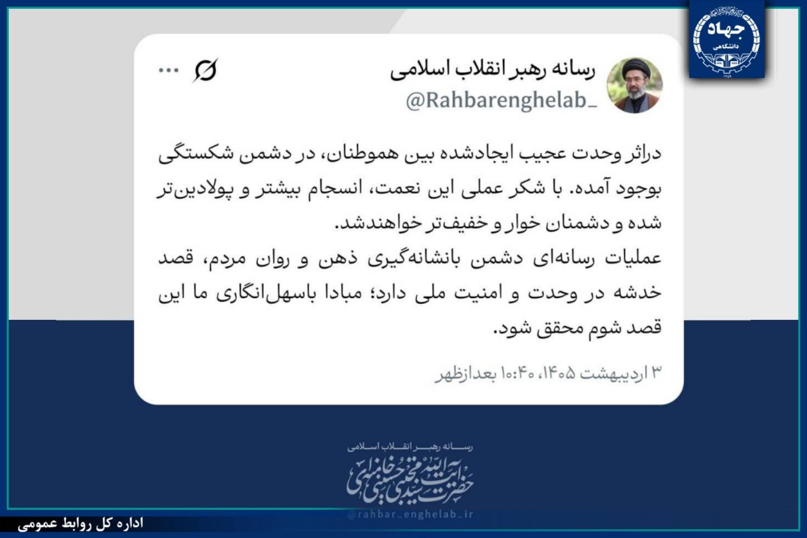 توییت جدید رسانه رهبر انقلاب/ در اثر وحدت عجیب ملت، در دشمن شکستگی بهوجود آمده است